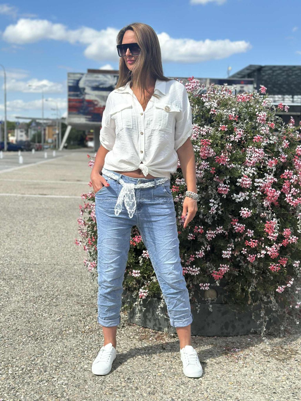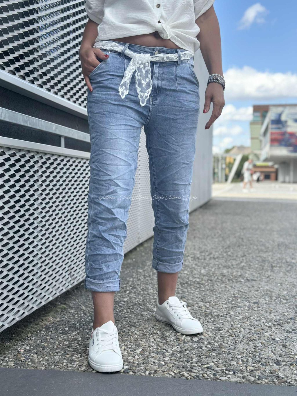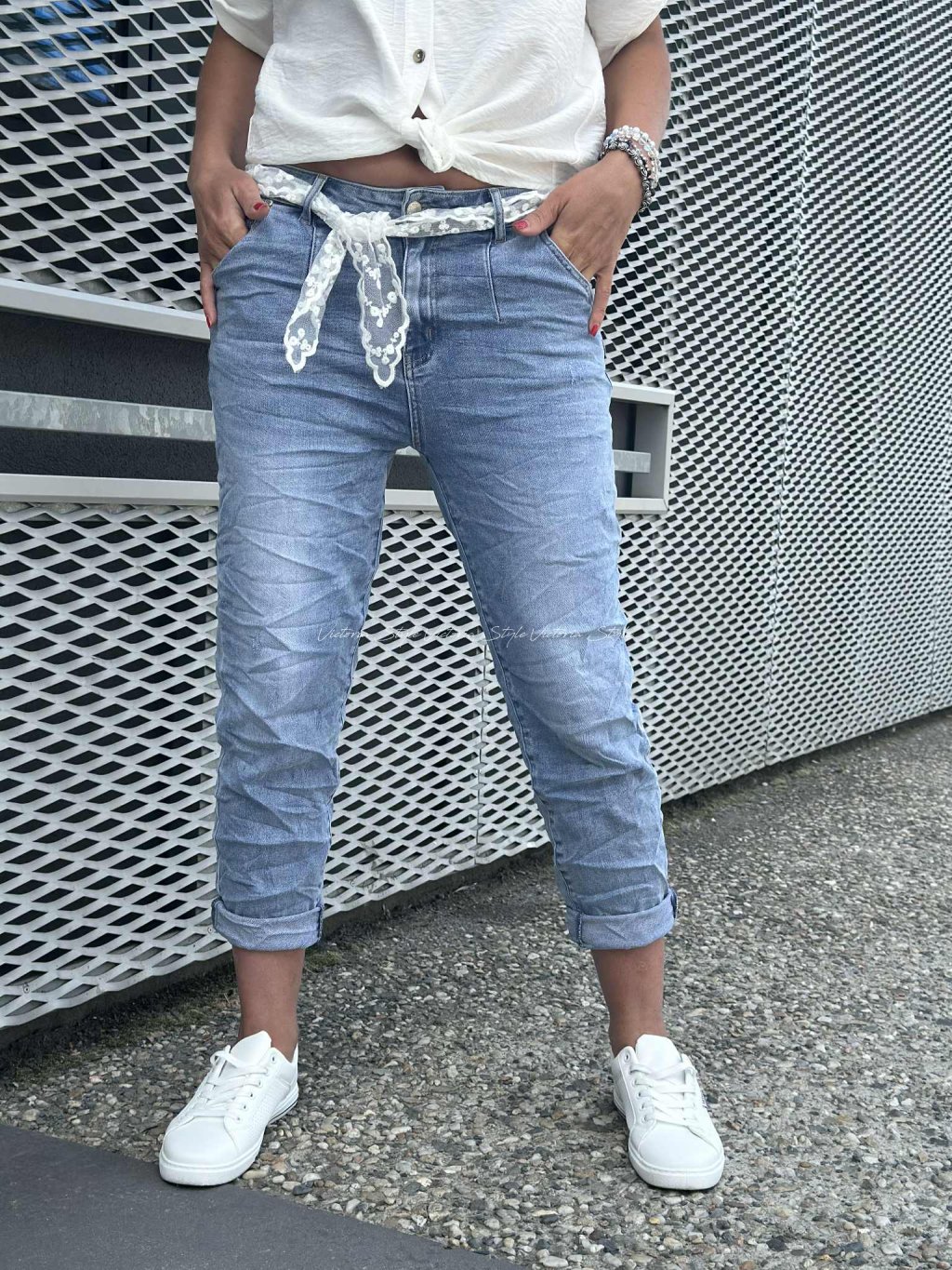 Modré džíny jsou klasika, která se hodí ke všemu. Vytvoříš s nimi spoustu variant outfitů. Velice pohodlné džíny Itaimaska s páskem.  Snížené zadní kapsy. Velikost: