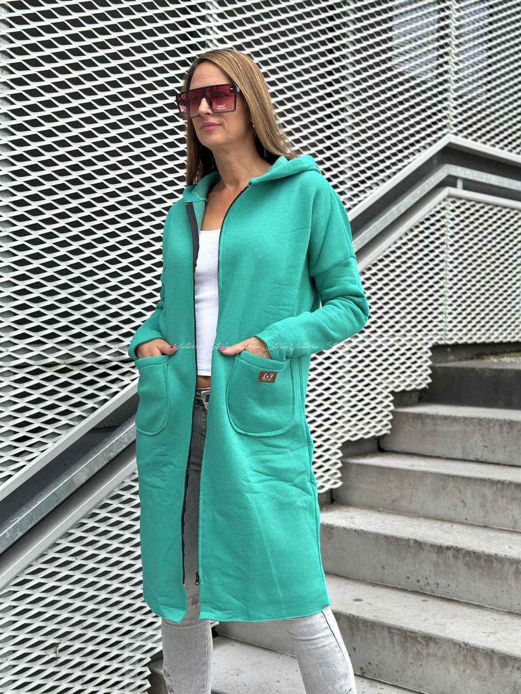 Perfektní volba pro každou příležitost. Pohodlná a praktická kabátková mikina Ruby kterou lze kombinovat s mnoha styly a typy oděvů.  Moderní mikina je nepostradatelnou součástí šatníku každé ženy. Delší mikina s kapucí, zdobená nášivkou. Šité přední kulaté kapsy. Velikost: Univerzální: Hrudník 98 - 120  cm, rukáv nezapracovaný 62 cm, délka 105 cm. Materiál: Hrubší bavlna, podšitá fleece, elastan