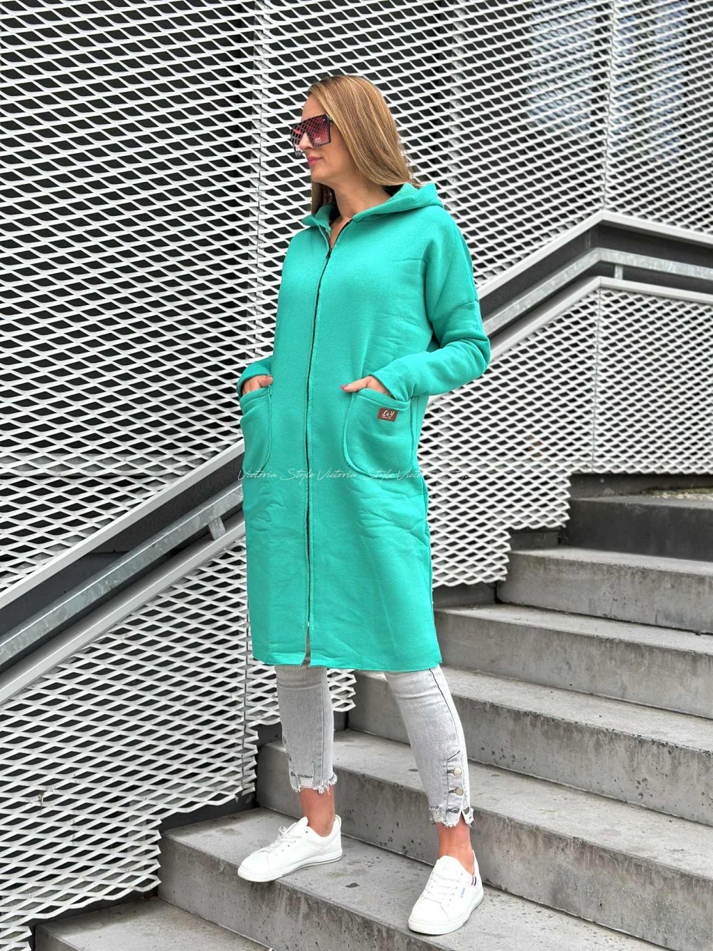 Perfektní volba pro každou příležitost. Pohodlná a praktická kabátková mikina Ruby kterou lze kombinovat s mnoha styly a typy oděvů.  Moderní mikina je nepostradatelnou součástí šatníku každé ženy. Delší mikina s kapucí, zdobená nášivkou. Šité přední kulaté kapsy. Velikost: Univerzální: Hrudník 98 - 120  cm, rukáv nezapracovaný 62 cm, délka 105 cm. Materiál: Hrubší bavlna, podšitá fleece, elastan