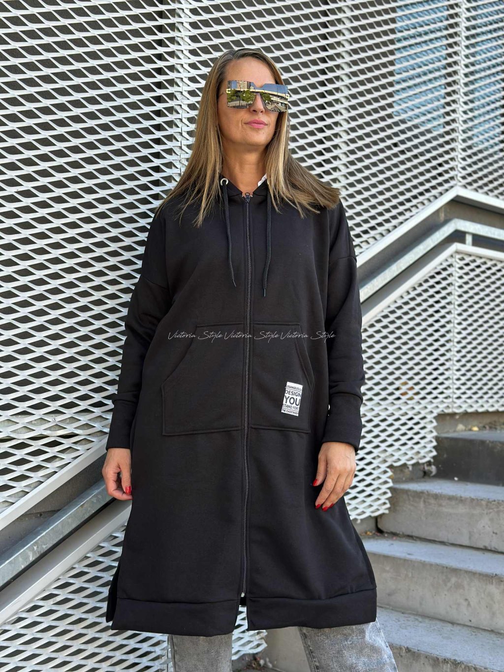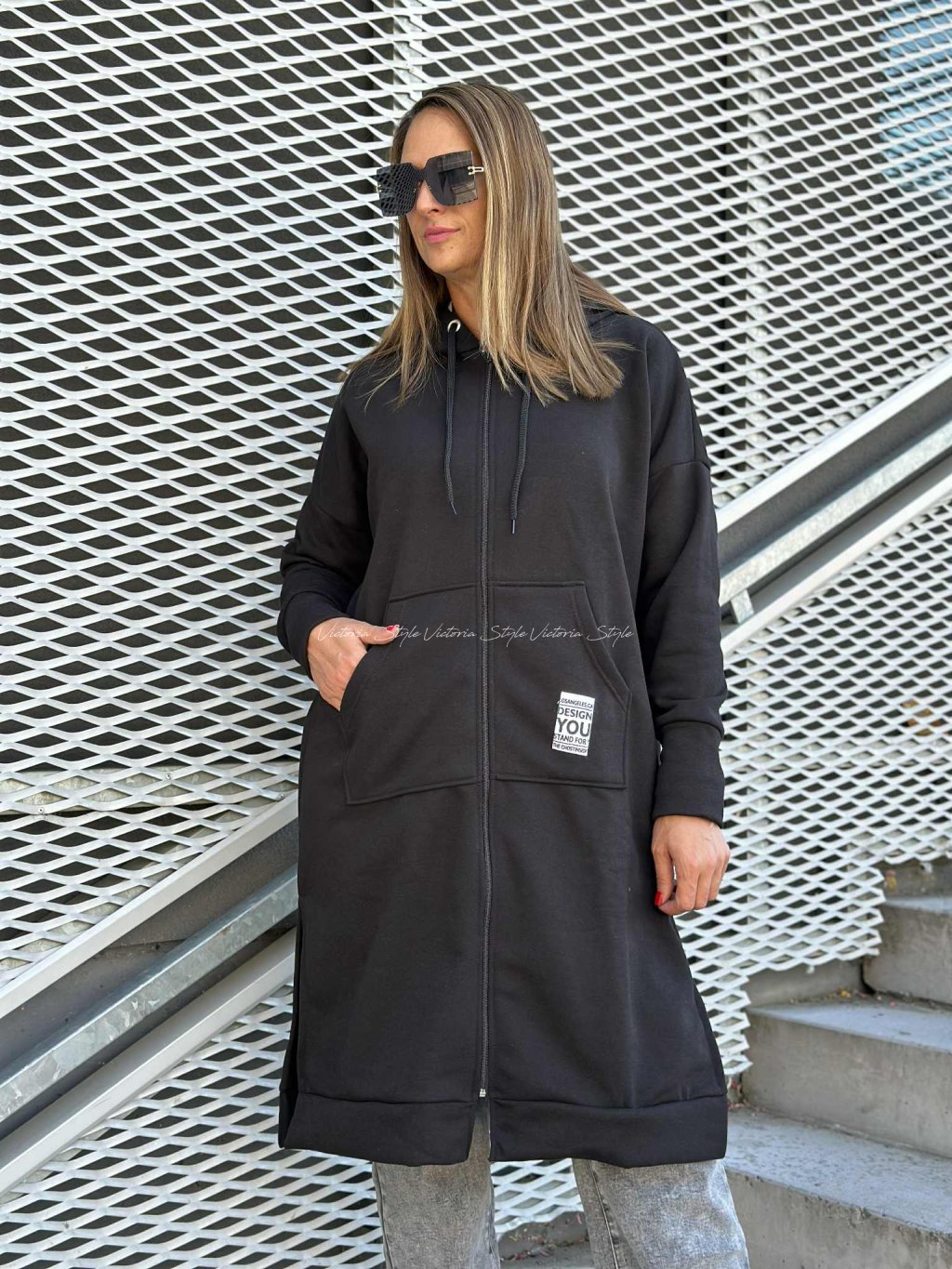 Perfektní volba pro každou příležitost. Pohodlná a praktická kabátková mikina Turaya, kterou lze kombinovat s mnoha styly a typy oděvů. Pořiďte si neokoukanou mikinu. Moderní mikina je nepostradatelnou součástí šatníku každé ženy. Delší mikina s kapucí, zdobená nášivkou. Šitá přední klokánková kapsa. Velikost: Univerzální: Hrudník 110 - 140 cm, rukáv 62 cm, na bocích rozparek, délka 105 cm. Materiál: Hrubší bavlna, podšitá fleece, elastan