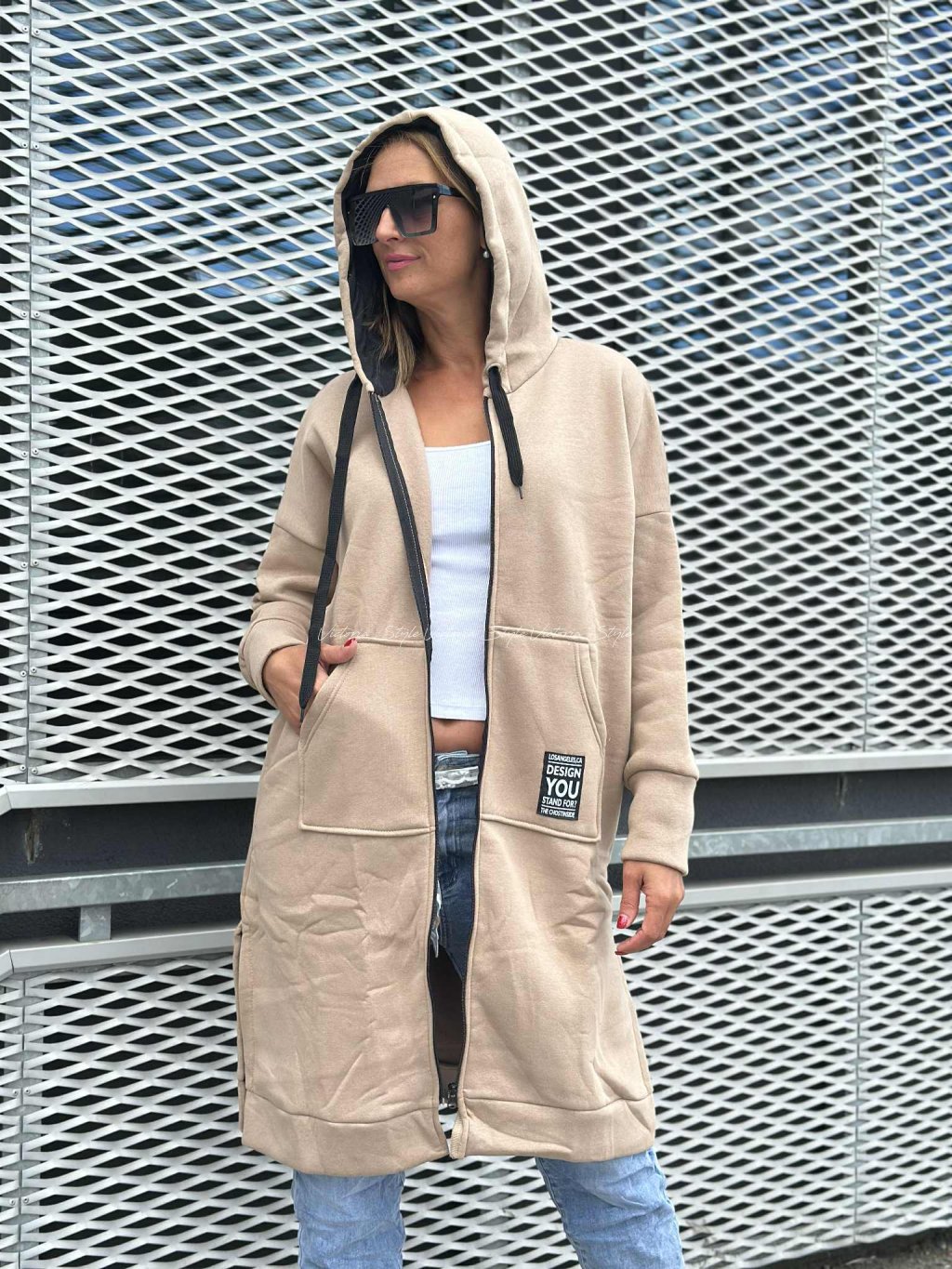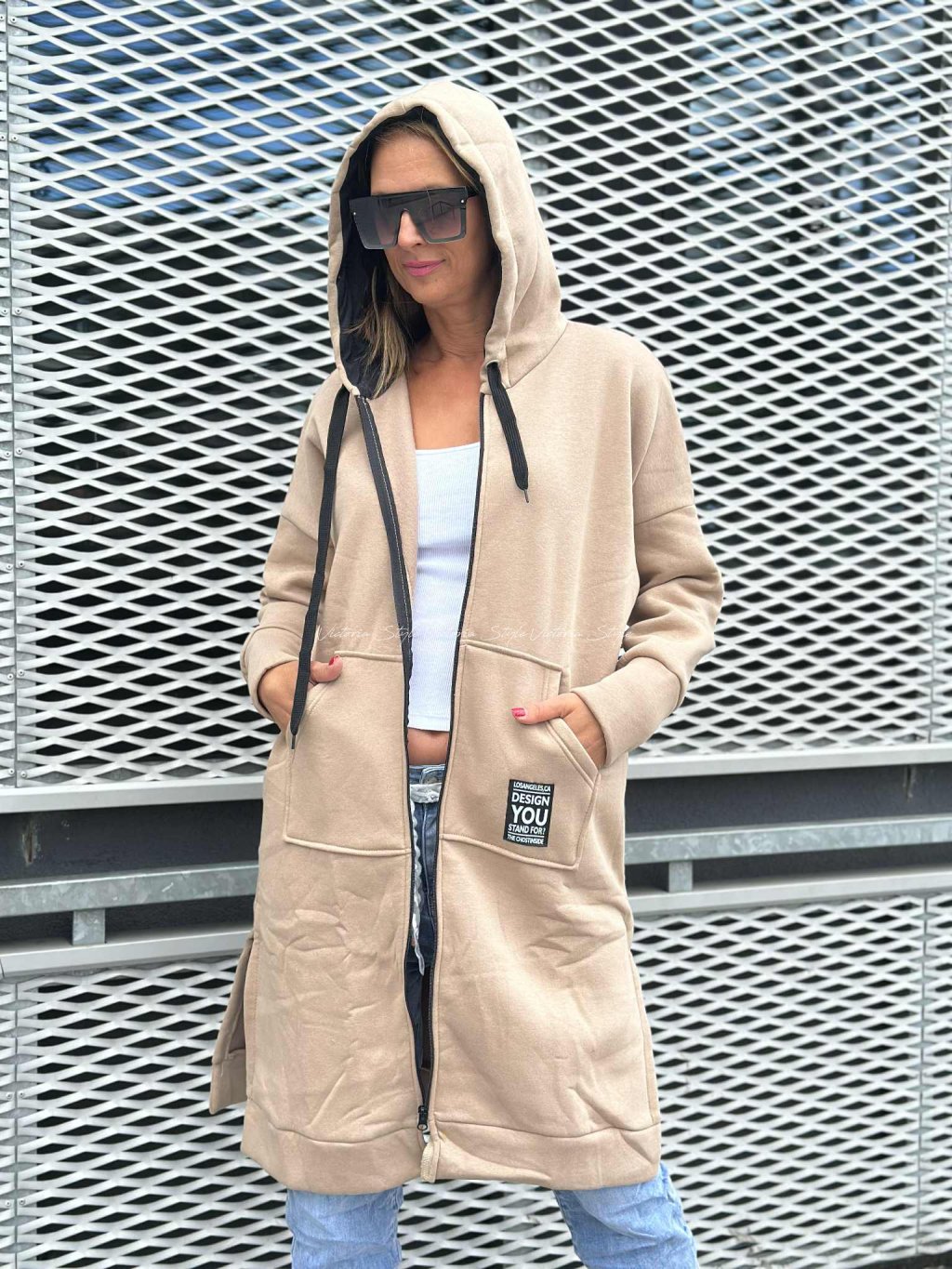 Perfektní volba pro každou příležitost. Pohodlná a praktická kabátková mikina Turaya, kterou lze kombinovat s mnoha styly a typy oděvů. Pořiďte si neokoukanou mikinu. Moderní mikina je nepostradatelnou součástí šatníku každé ženy. Delší mikina s kapucí, zdobená nášivkou. Šitá přední klokánková kapsa. Velikost: Univerzální: Hrudník 110 - 140  cm, rukáv 62 cm, na bocích rozparek, délka 105 cm. Materiál: Hrubší bavlna, podšitá fleece, elastan