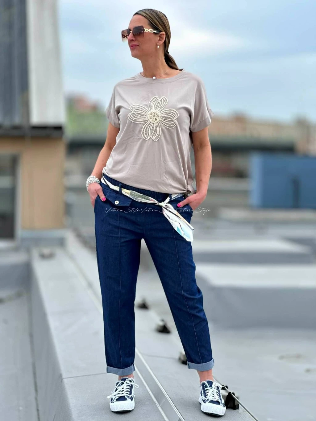 Kalhoty jako základ outfitu. Kombinace pohodlí a stylu. Naprosto pecka kalhoty Basma s šátkovým páskem, šité v ležérní eleganci. Velikost: Obvod pupek 90 - 106 cm, boky 100 - 125 cm, délka 96 cm. V pase na elastickou gumu. Šitá přední kapsička. Materiál: Jemná riflovina, gramážově hrubší bavlna, viskoza, elastan.