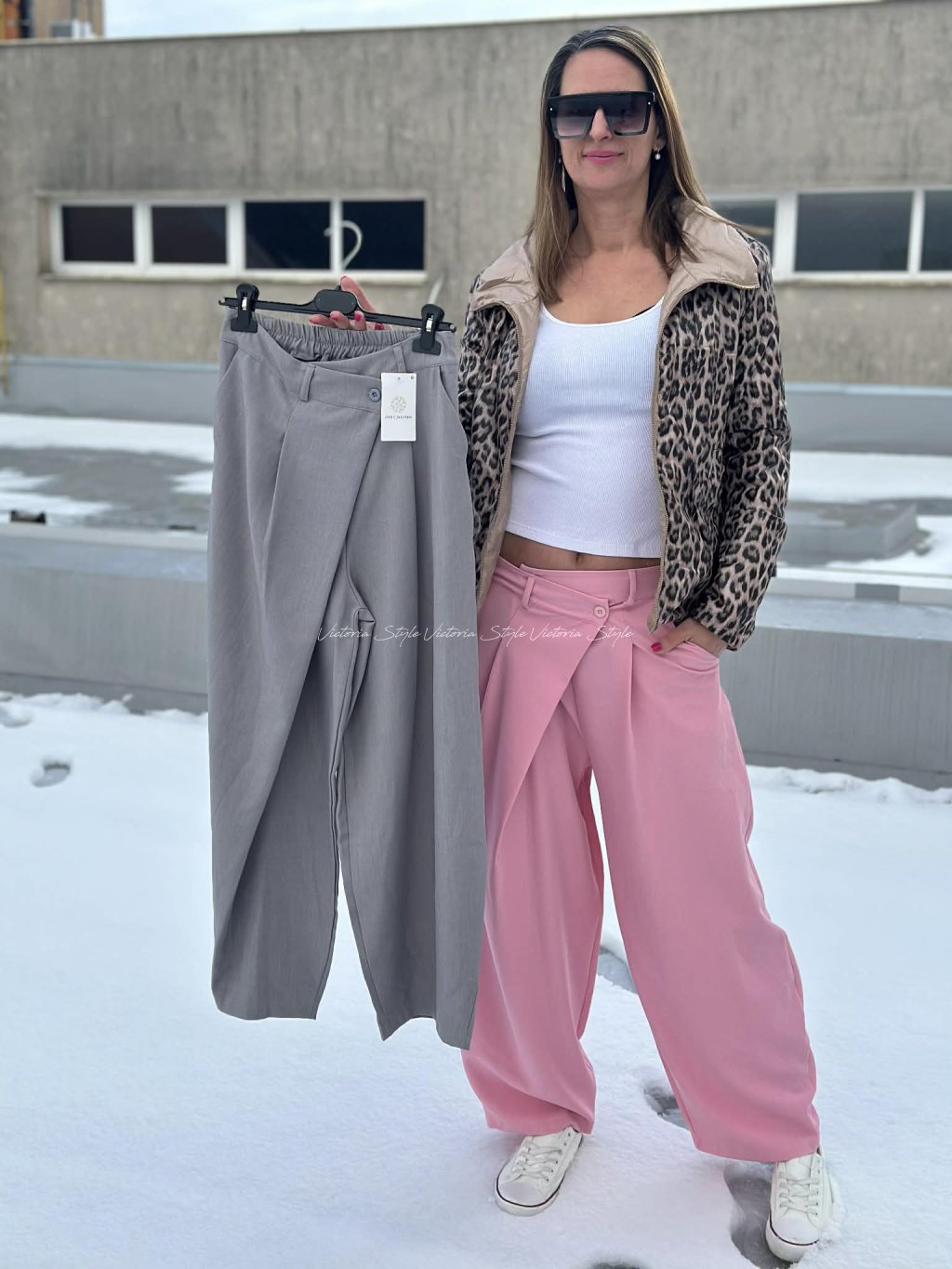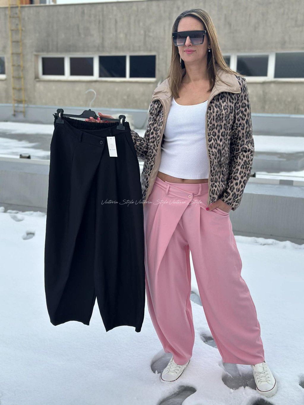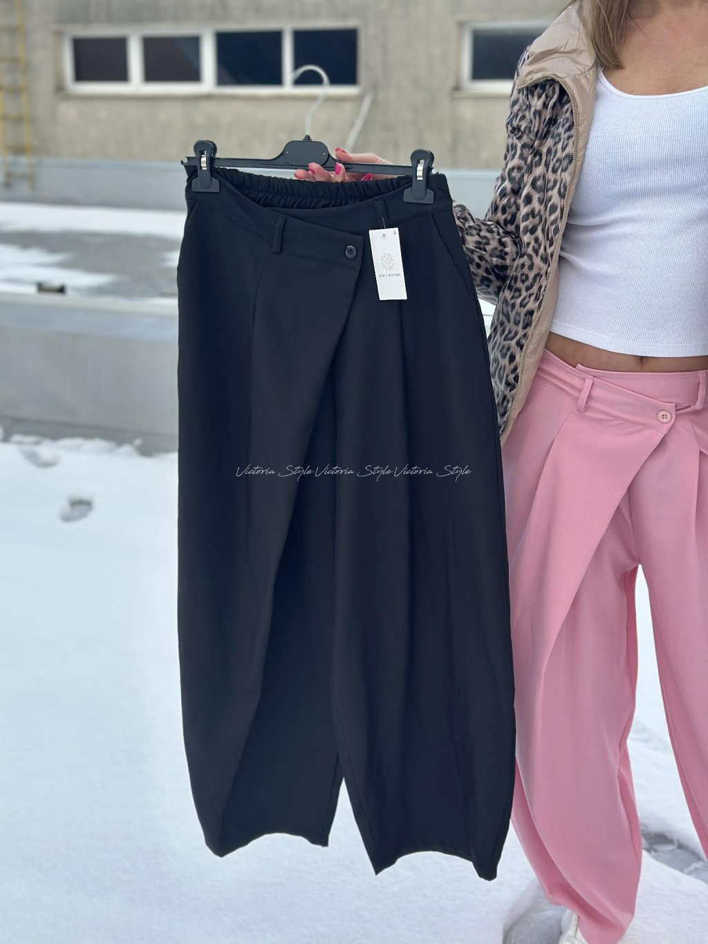Kalhoty s promyšleným designem, šité v ležérní eleganci. Kombinace pohodlí a stylu. Kalhoty Chrisi jako základ outfitu, přední část v překříženém střihu. Sladitelné ke všem outfitum. Velikost: Obvod pupek 90 - 100 cm, boky 100 - 125 cm, délka 100 cm. Materiál: Gramážově vynikající polyamid, elastan.