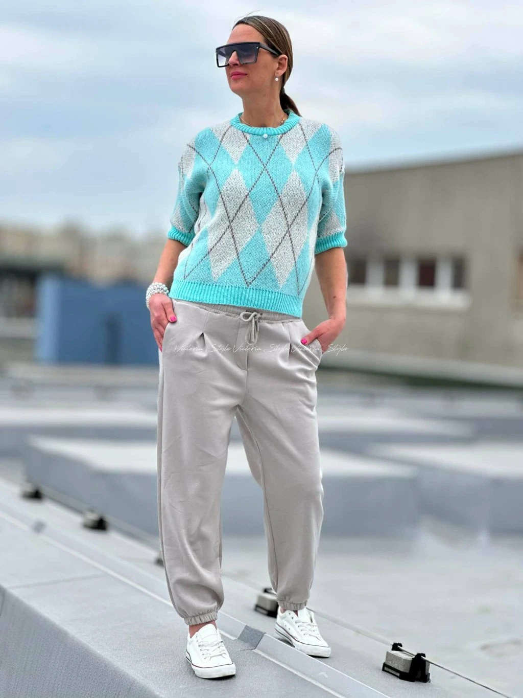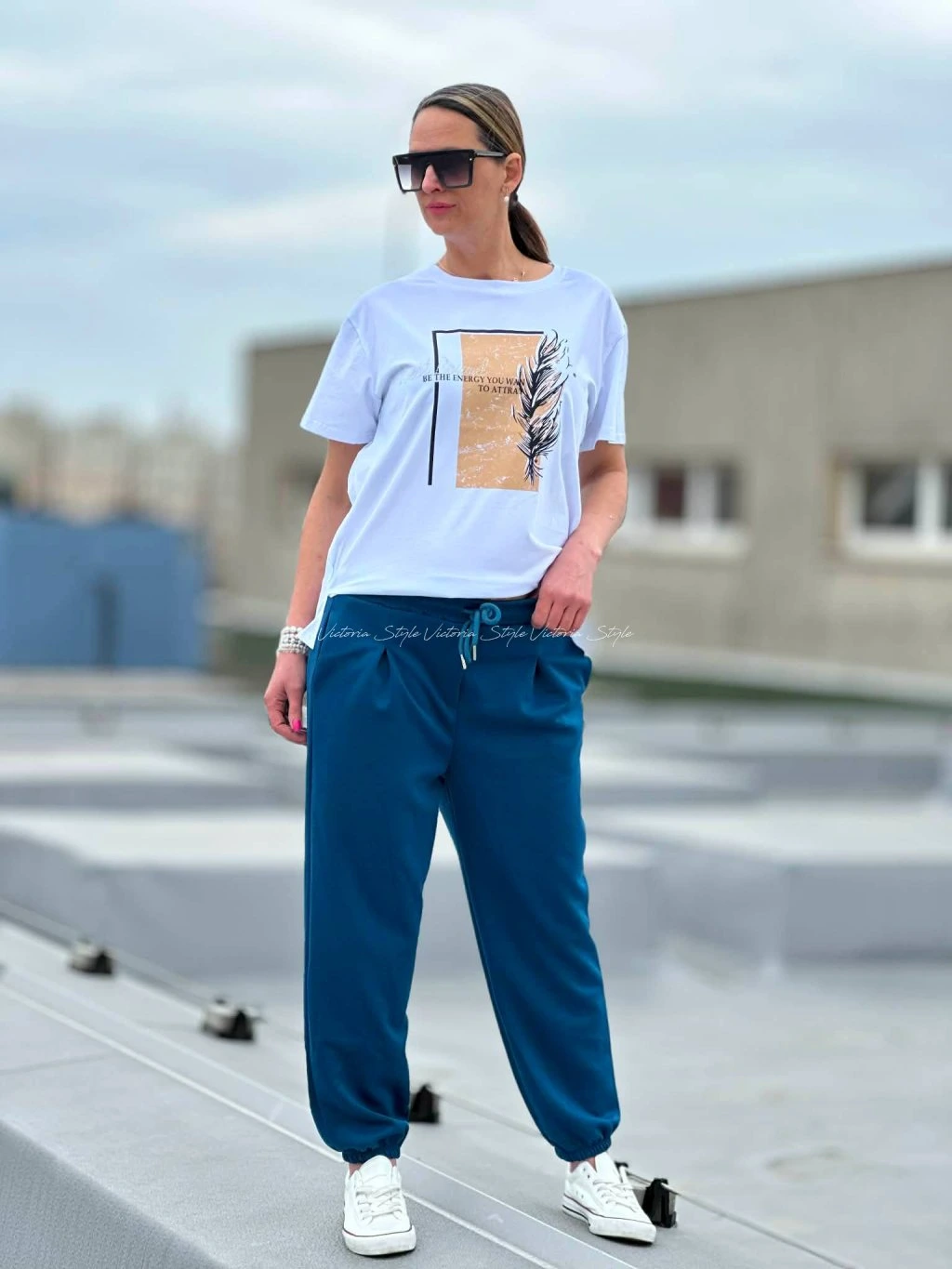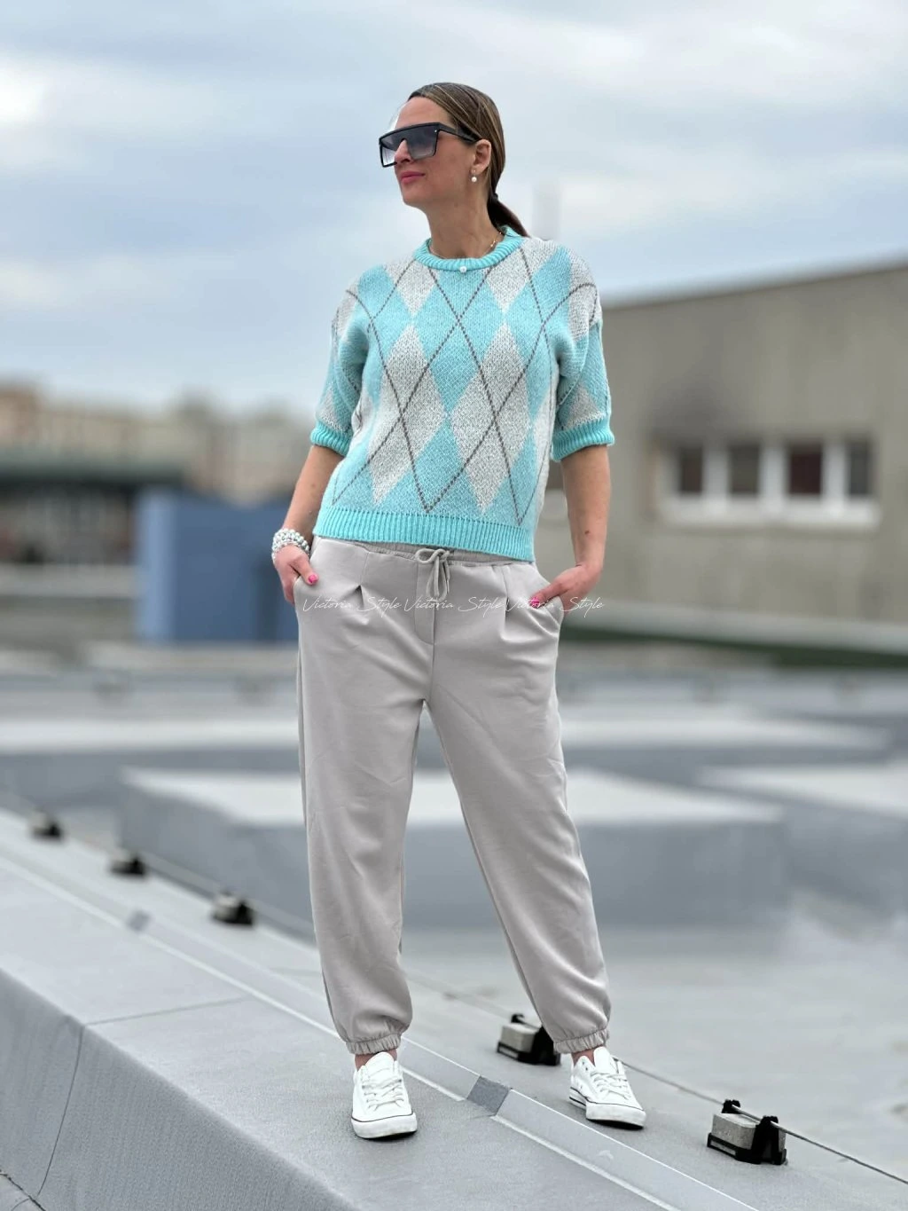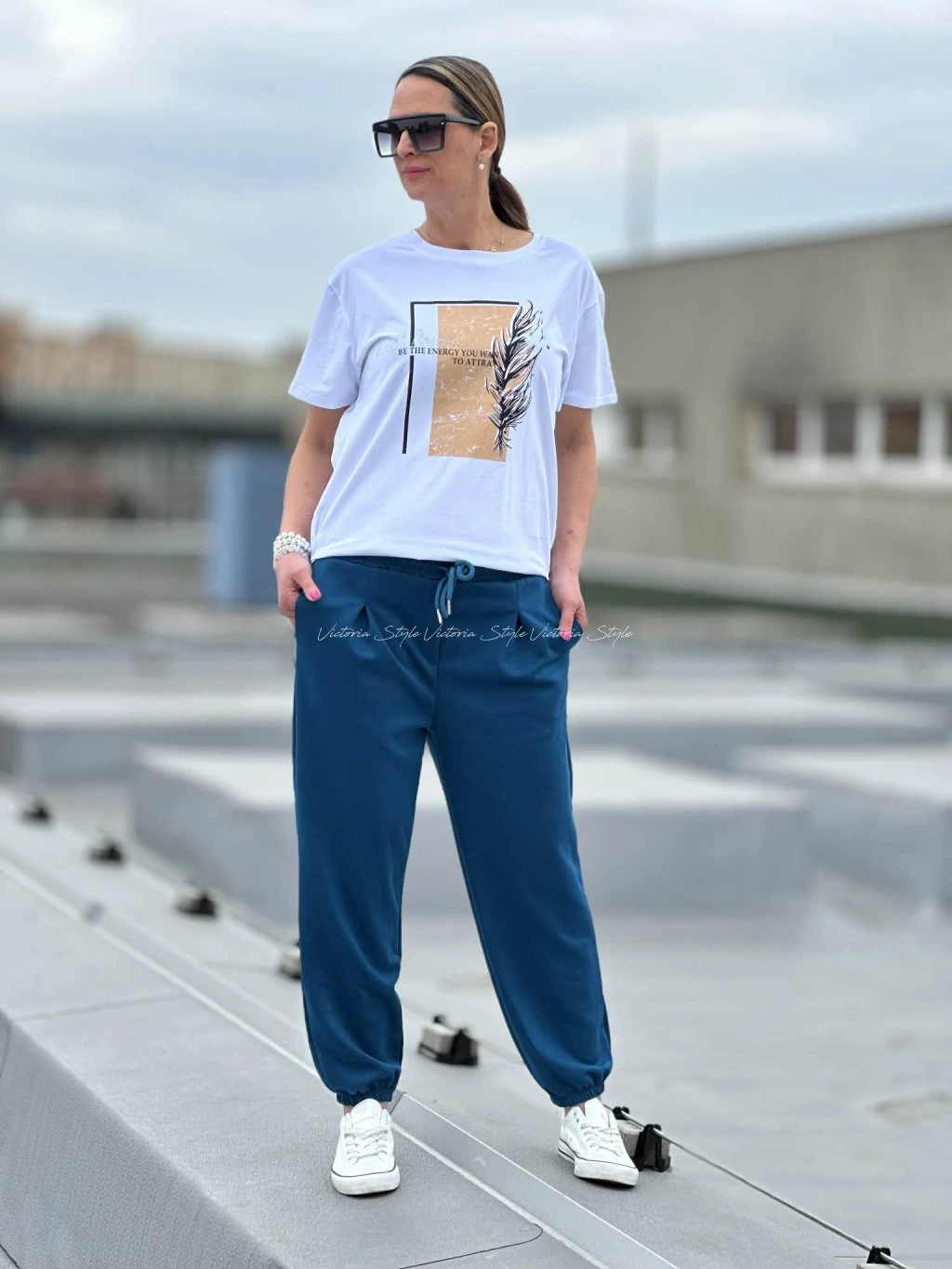 Kombinace pohodlí a stylu. Kalhoty s promyšleným designem, šité v ležérní eleganci. Kalhoty Cosima jako základ outfitu. Sladitelné ke všem outfitum. Šité přední kapsy. Spodní část kalhoty v elastické gumě. Velikost: obvod pupek 93 - 106 cm, boky do 120 cm, délka 95 cm. Materiál: Viskoza, polyester, tkz.maslový materiál, elastan