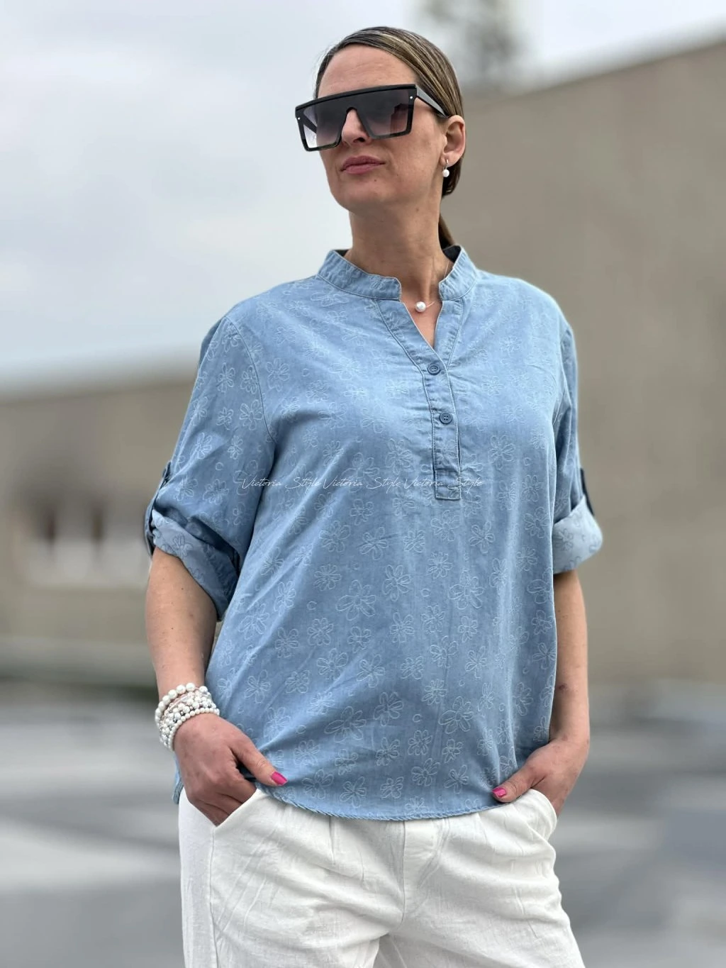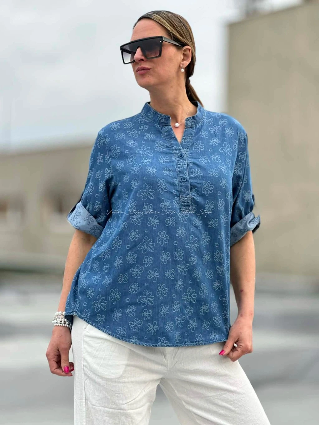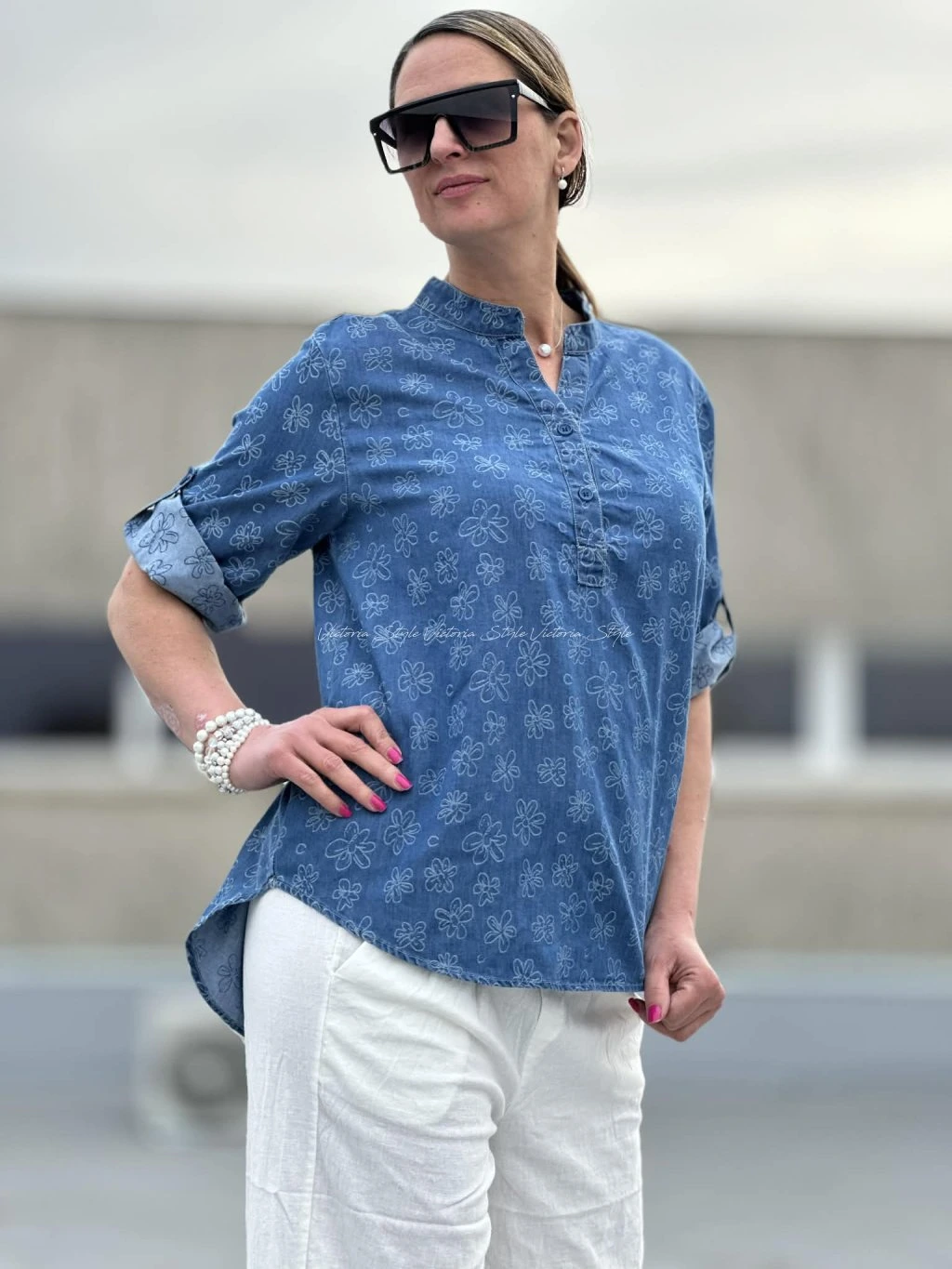 Košile je klíčový prvek každodenního stylu, který by neměl chybět ve vašem šatníku. Je to všestranný oděv, který v kombinaci s doplňky získá úplně jiný charakter. Stylová a pohodlná košile Mahera, krásný kytičkový vzor. Velikost: Hrudník 93 - 103 cm, délka 64 - 74 cm. Zadní díl v prodloužení. Materiál: Velice kvalitní bavlna, elastan. Materiál na omak jak jemná džínovina.