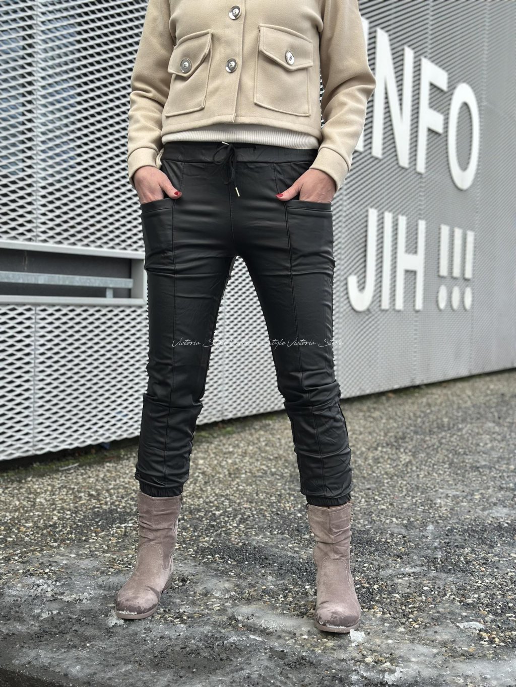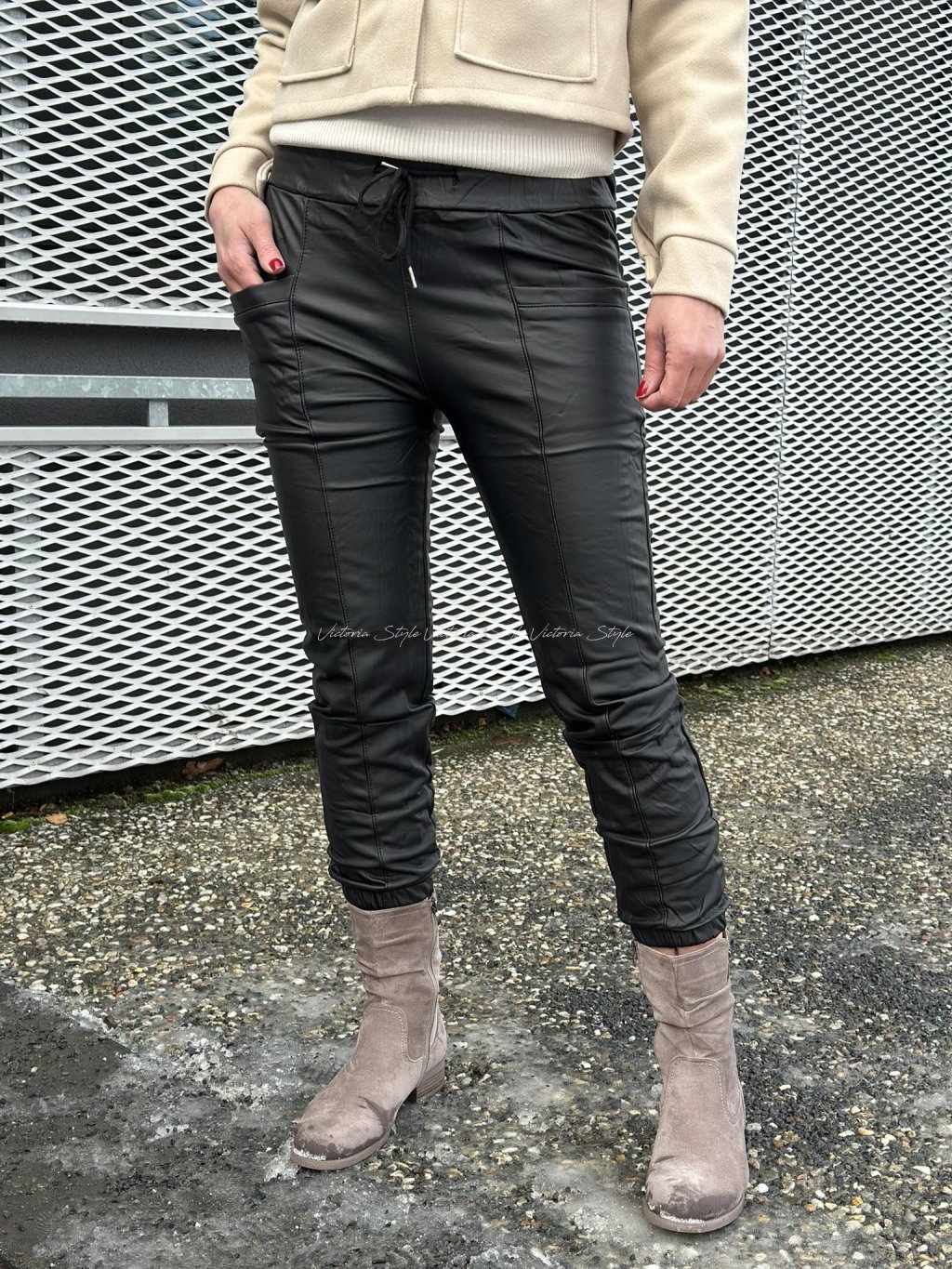 Koženkové kalhoty s promyšleným designem, šité v ležérní eleganci. Kombinace pohodlí a stylu. Kalhoty Sharon jako základ outfitu. Šité přední moderní hluboké kapsy. Spodní část nohavic v gumě. Sladitelné ke všem outfitum. Vynikající ke kotníkovým botám. Velikost: Pružné