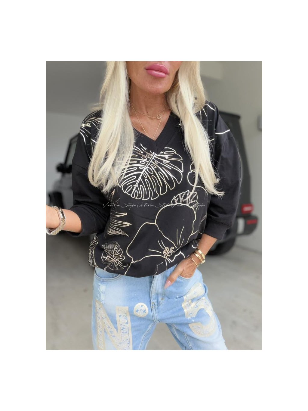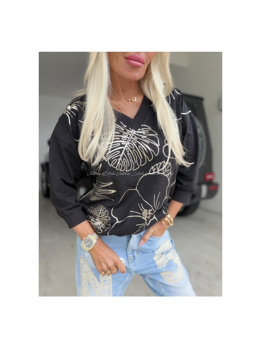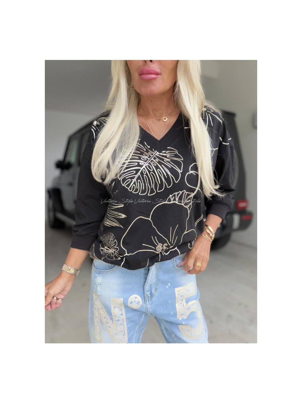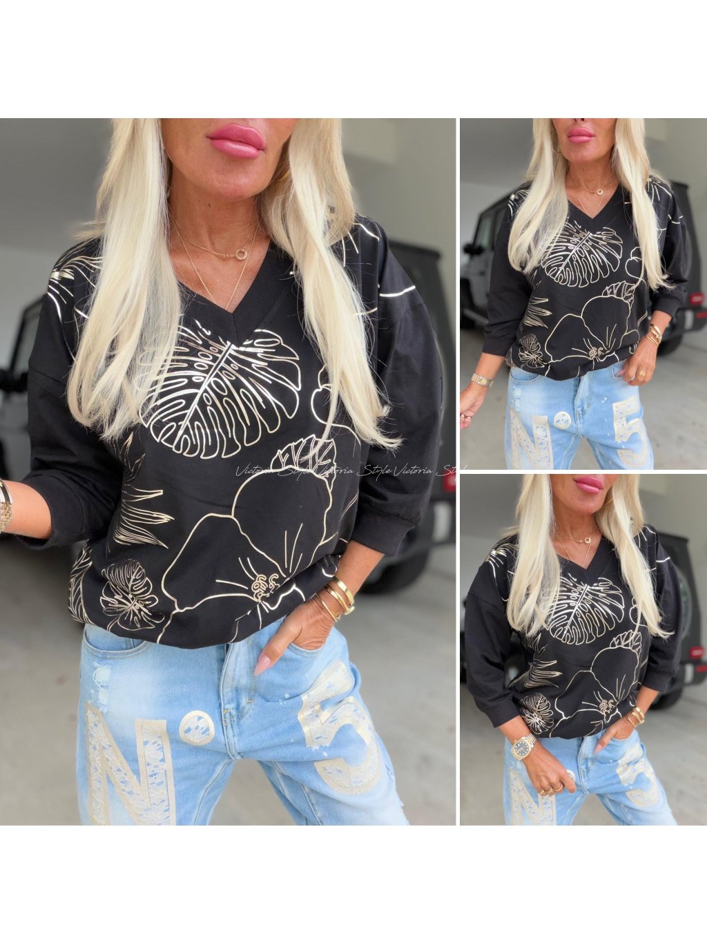 Perfektní volba pro každou příležitost. Pohodlné triko, které lze kombinovat s mnoha styly a typy oděvů. Triko Hannan, zdobené květy. Véčkový výstřih v úpletovém vzoru. Velikost: Hrudník 95 - 105 cm, délka 64 cm. Materiál: Kvalitní hrubší bavlna, viskoza, elastan