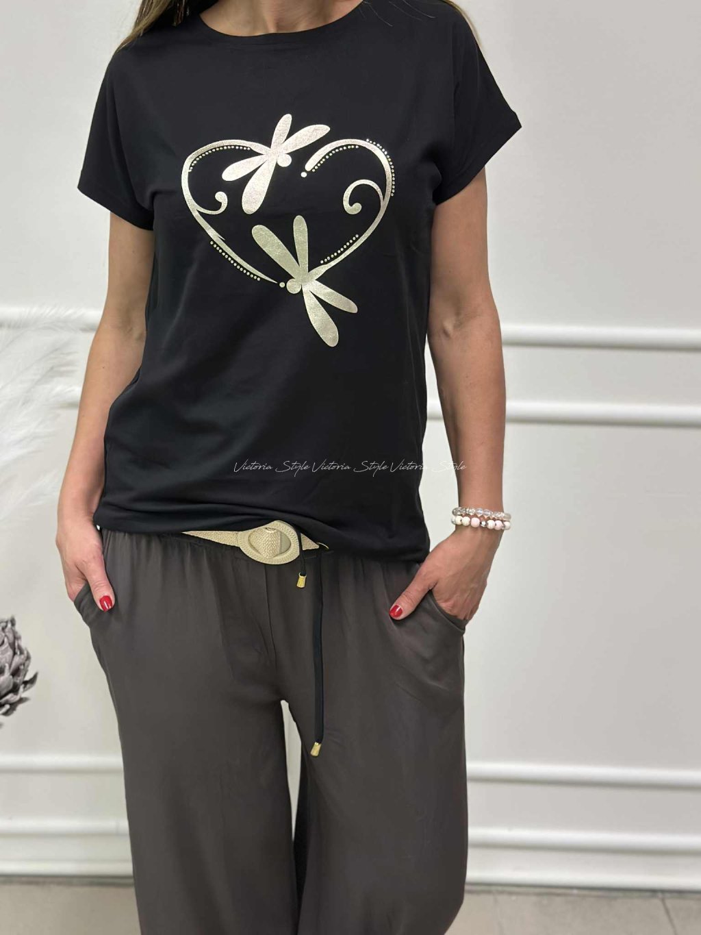 Perfektní volba pro každou příležitost. Pohodlné triko, lze kombinovat s mnoha styly a typy oděvů. Triko Naysa, zdobené vážkou vykládanou třpytkovými kamínky.. Velikost: Univerzání. Hrudník 85 - 98 cm, délka 65 cm. Materiál: Kvalitní hrubší bavlna, elastan