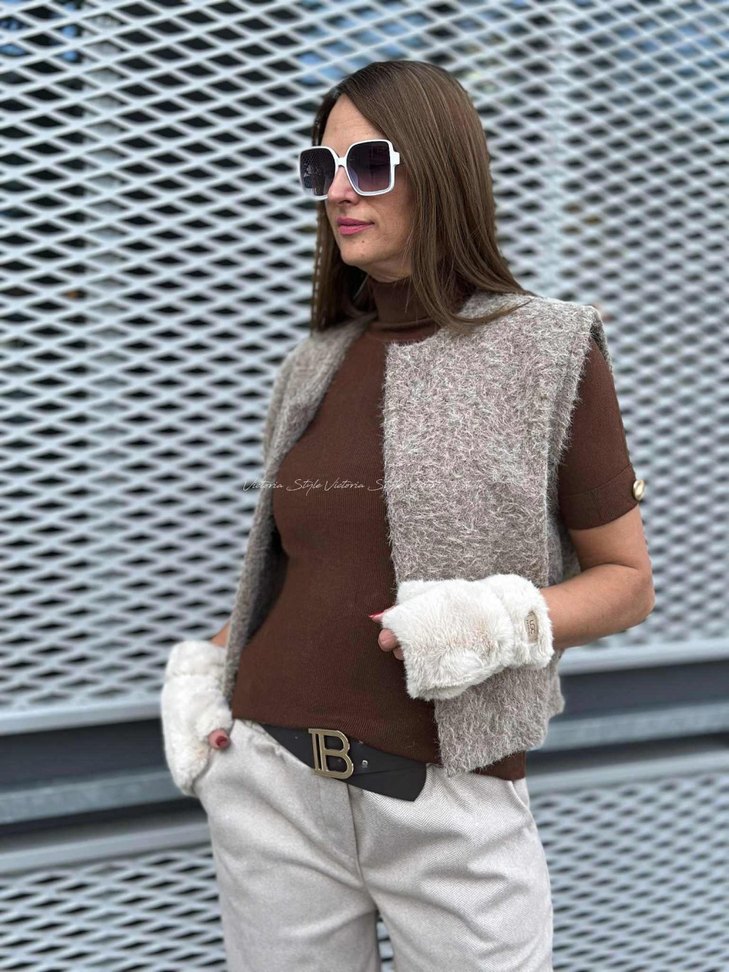 Styl nás prostě baví. Perfektní volba pro každou příležitost. Vesta Ruby, kterou lze kombinovat s mnoha styly a typy oděvů. Dokonalé řešení na přechodové období. Slušivý střih a moderní design. Velikost: Univerzální. Hrudník 94 - 108 cm, délka 55 cm. Šité přední kapsy. Vestička se nezapíná. Materiál: Gramážově hrubší, teplejší. Polyester, elastan