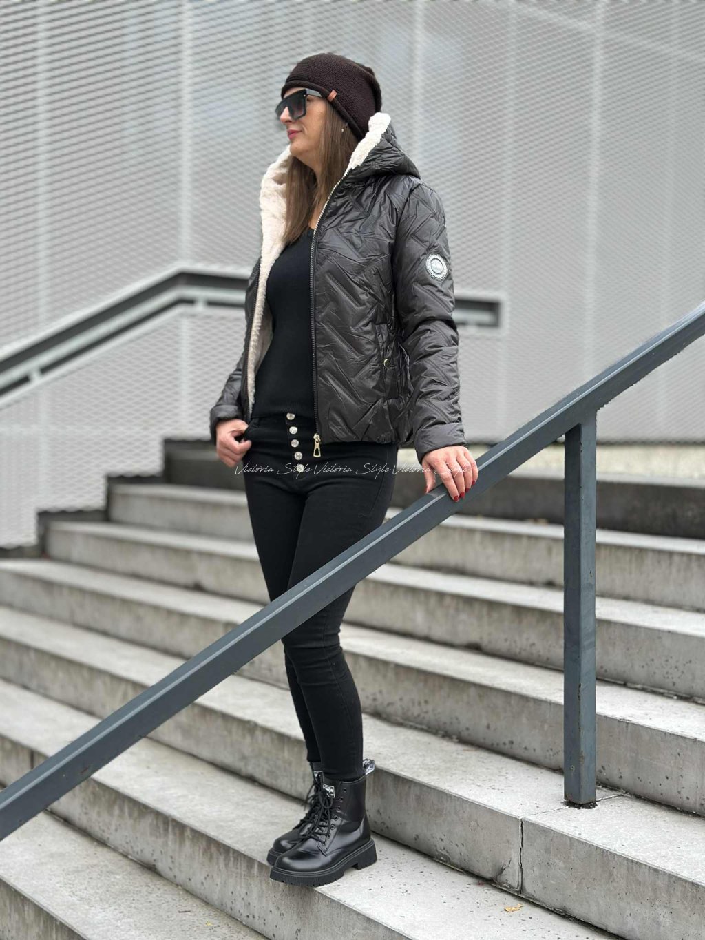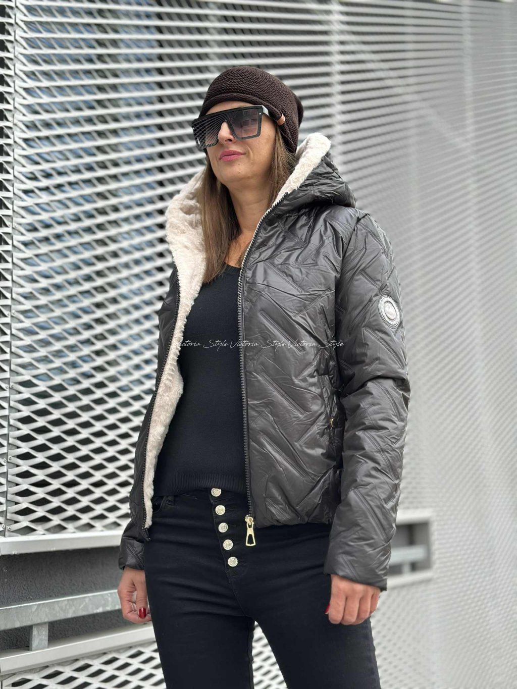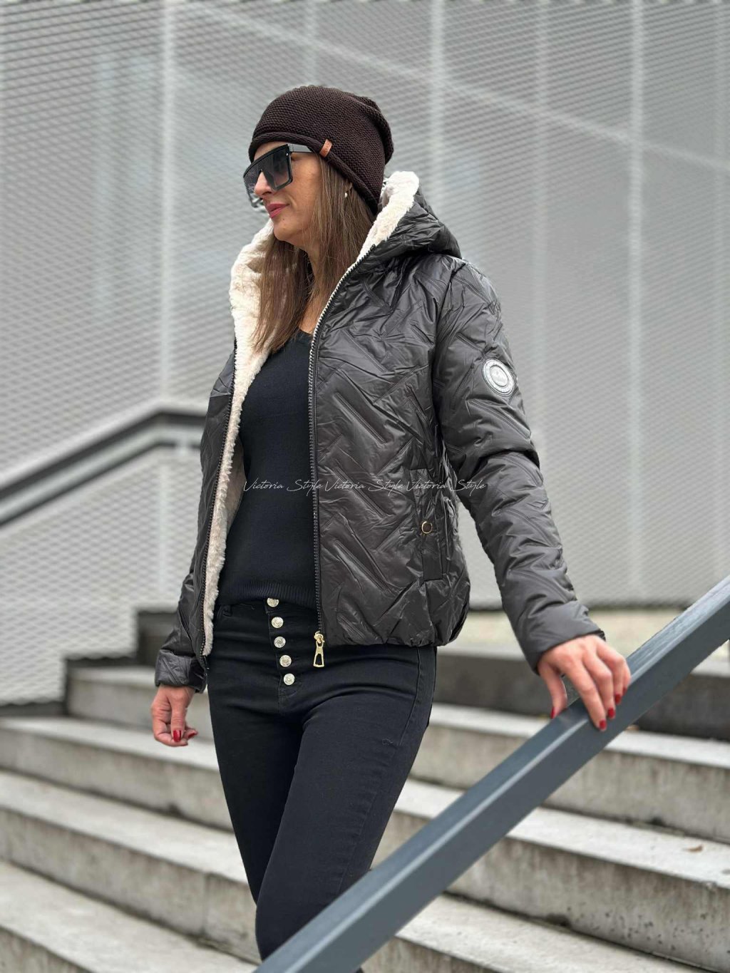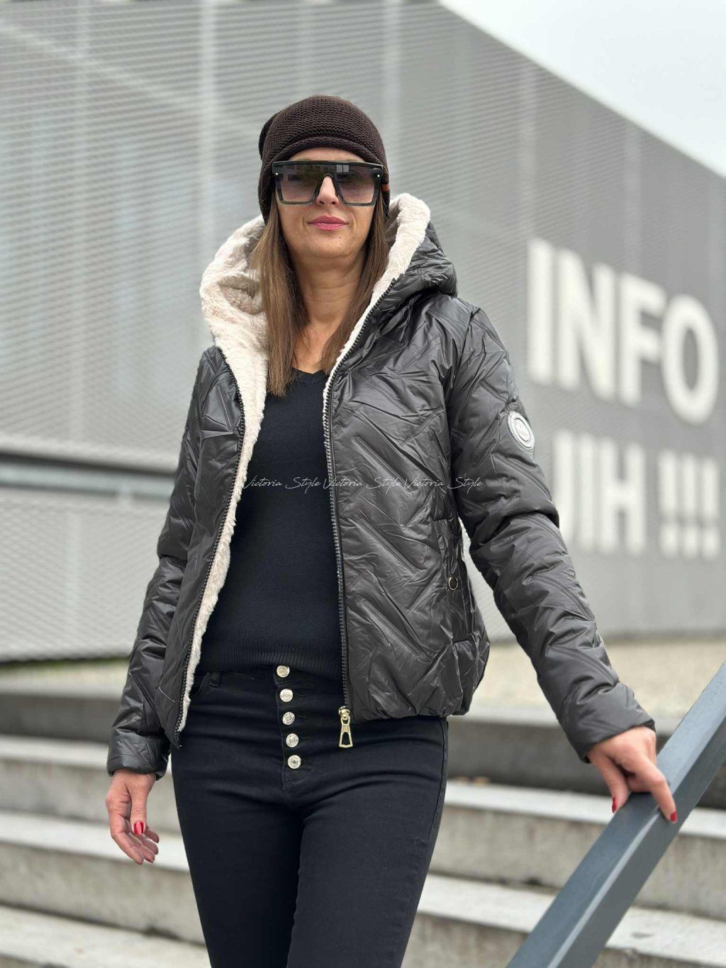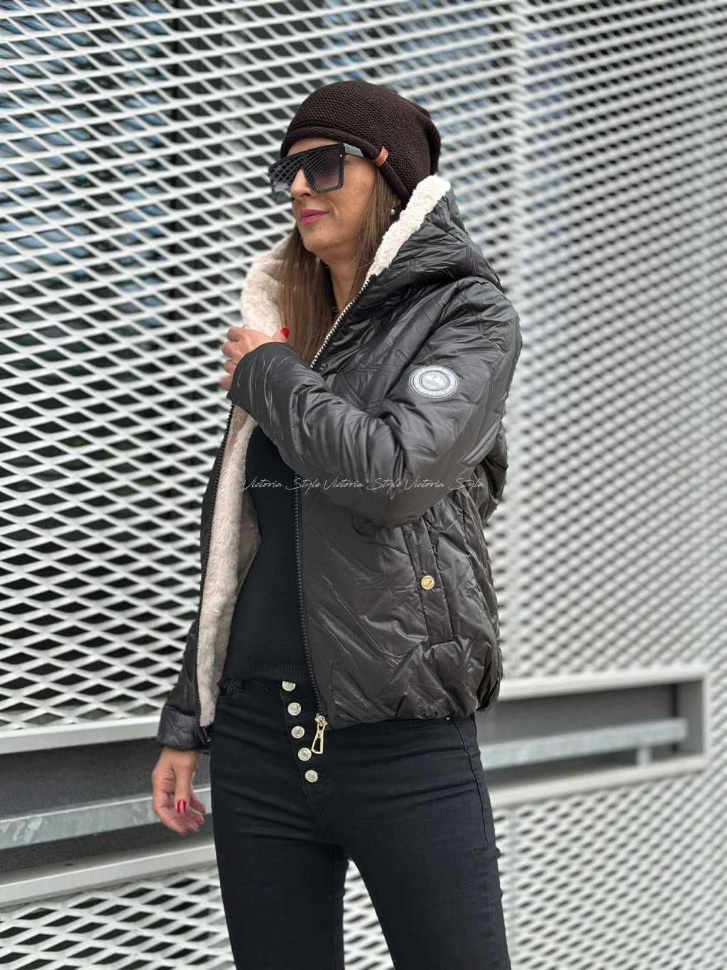 Materiál: Polyester, elastan, prošívaná, polstrovaná, zateplená kožíškem. Kapuce není odnímatelná. Rukáv zdobený nášivkou.